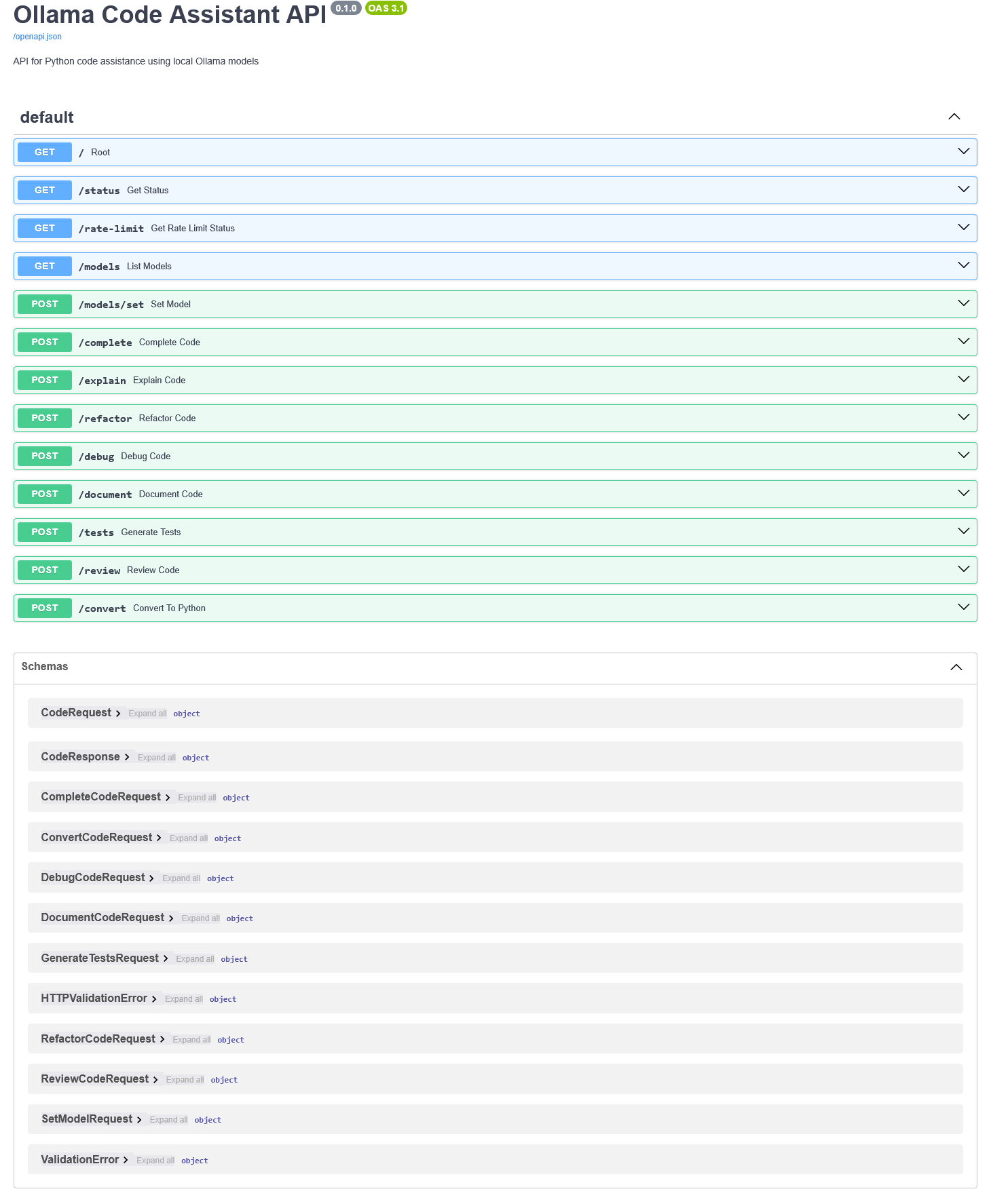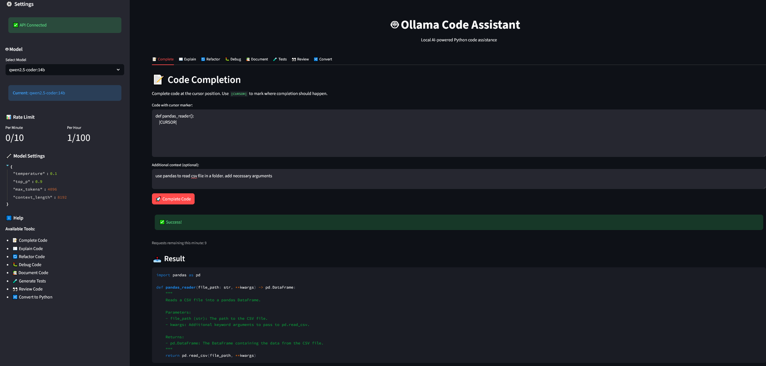 API’yi test ettikten sonra sıra Streamlit arayüzüne geldi. Burada da streamlit_app.py dosyasını oluşturdu. Arayüzde sol tarafta model seçimi, rate limit detayları ve modelin çalışıp çalışmadığını gösteren kısımlar bulunurken arayüzün ana içeriğinde ise sekmelerle seçilen fonksiyonlar ve sonuçların gösterileceği alan var. Sekmelere göre (complete, explain, refactor, debug, document, tests, review, convert) butonlar ve ek parametreler değişiyor. Butonlara basıldığında FastAPI altındaki endpoint’lere istek atılıyor ve sonuçlar arayüzde gösteriliyor.