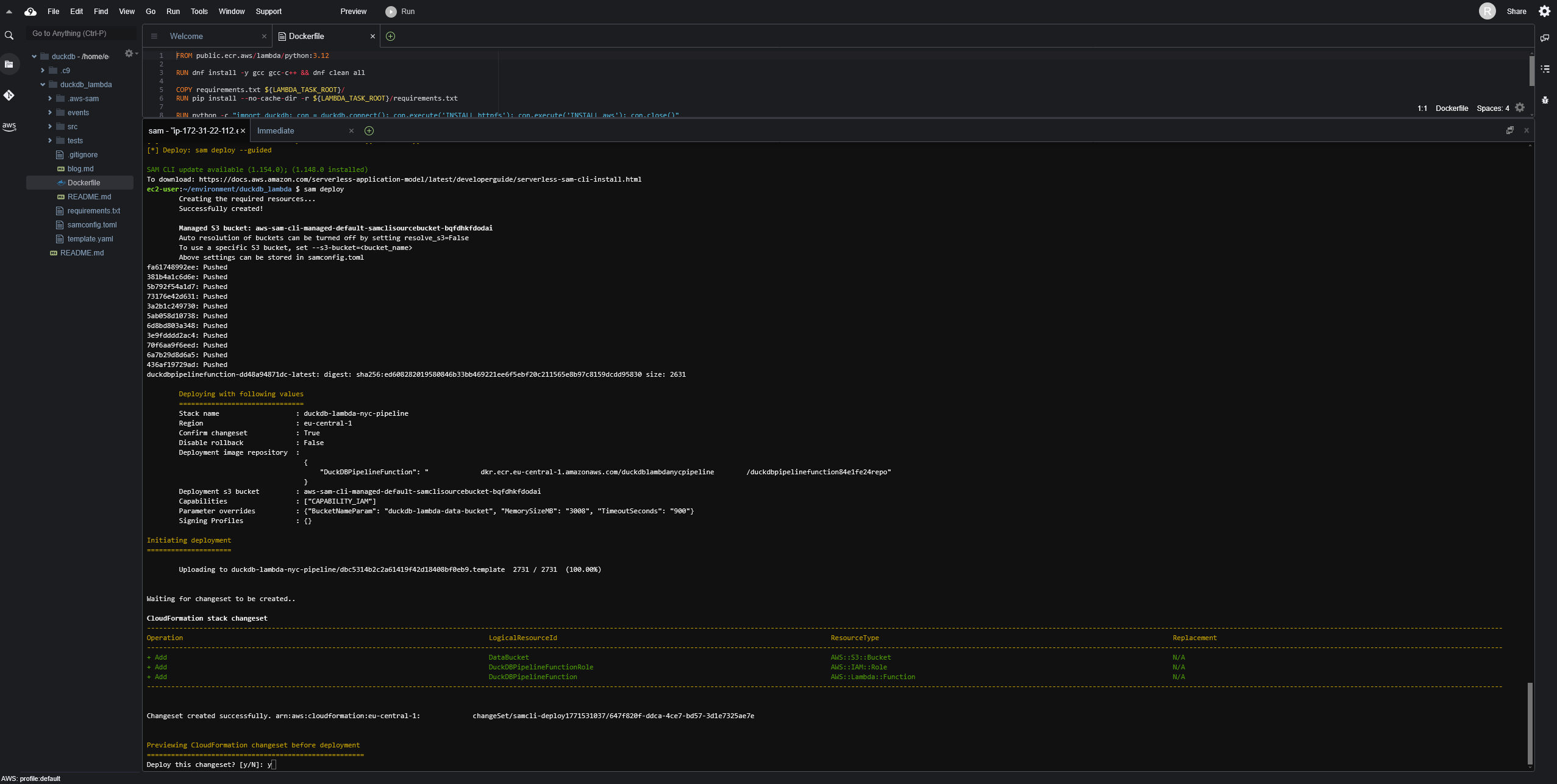Lambda fonksiyonumuz container image olarak çalıştığı için Dockerfile’ı oluşturuyoruz ilk olarak. Dockerfile’da dikkat edilmesi gereken nokta ise DuckDB extension’larının (httpfs, aws) imaj oluşturulurken yüklenmesi. Lambda runtime’ında internete çıkış olmayabileceği için extension’ları önceden yüklüyoruz.