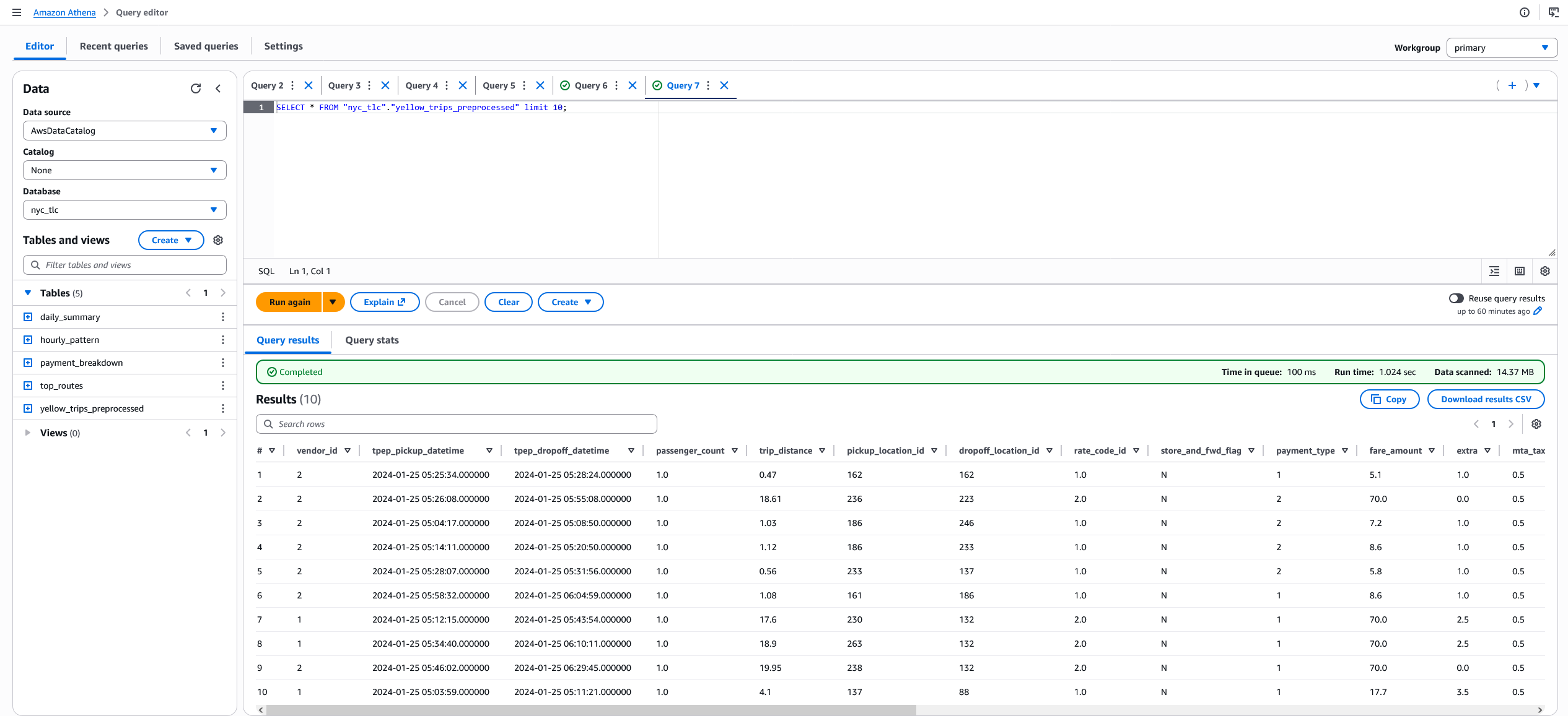 Pipeline tamamlandıktan sonra tüm tablolar Glue Data Catalog’da nyc_tlc database’i altında görünür. Athena ile doğrudan sorgulanabilir.