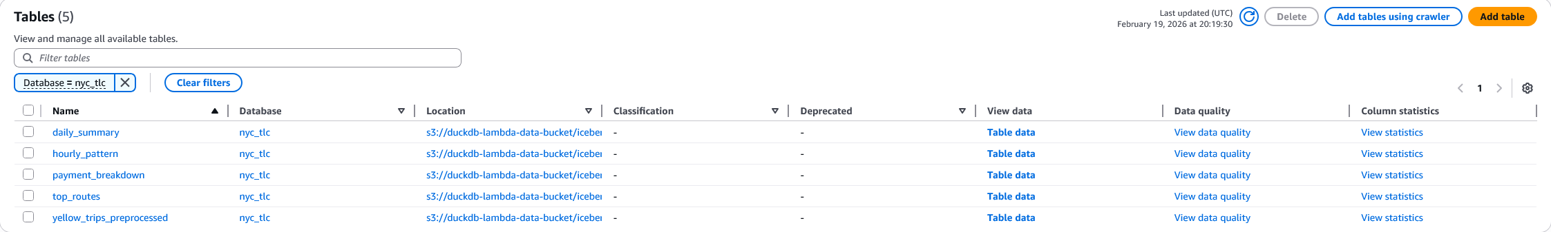 Tüm aşamalar tek bir Lambda fonksiyonu üzerinde çalışıyor. Lambda container image olarak deploy ediliyor ve SAM (Serverless Application Model) ile yönetiliyor. İlk aşamada NYC TLC’nin CloudFront endpoint’inden parquet dosyaları S3’e indiriliyor. İkinci aşamada DuckDB SQL ile veri temizleme ve dönüşüm işlemleri yapılıyor, sonuç Iceberg formatında S3’e yazılıyor. Son aşamada ise işlenmiş tablo üzerinden çeşitli özet (aggregation) sorguları çalıştırılarak analiz sonuçları ayrı Iceberg tablolarına yazılıyor. Tüm tablolar Glue Data Catalog’da nyc_tlc database’i altında kayıtlı oluyor ve Athena ile sorgulanabiliyor.