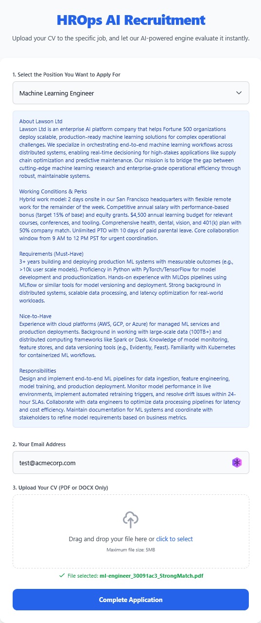 İlan başvurularının alınabilmesi için Gemini kullanarak Tailwind CSS tabanlı basit bir arayüz hazırladım. Bu arayüzde adaylar ilan detaylarını görüntüleyebiliyor ve CV’lerini yükleyebiliyor. Form gönderildiğinde dosya, API Gateway üzerinden S3’e yüklenecek şekilde akışa dahil ediliyor.